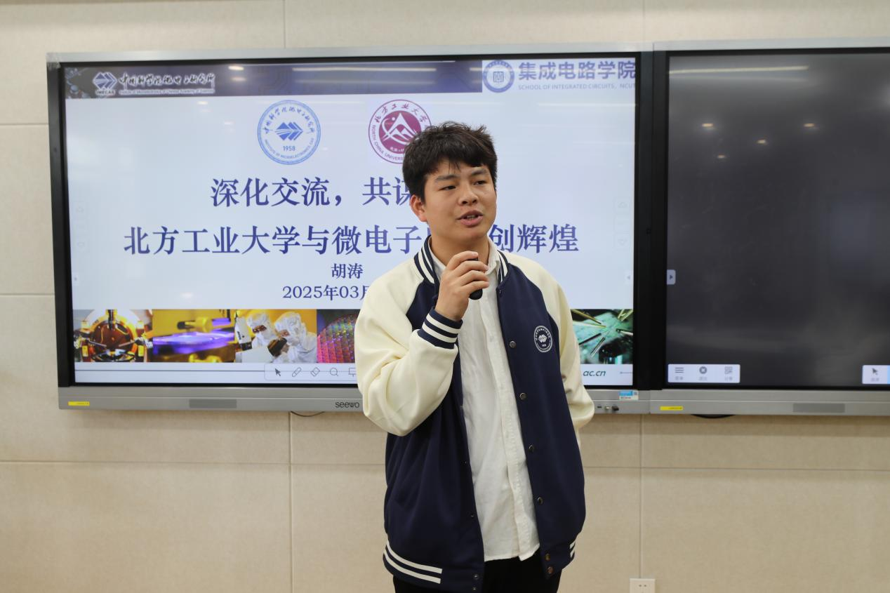微电子所研究生会副主席胡涛展示研究所科研成果,提出联合党建与学术合作愿景。通过校史馆参观,详细了解了学校的办学历程、办学特色、办学成就,深入了解了我校校训、校风、校徽等学校文化的深刻内涵,深化两校对彼此发展历程与科技贡献的认知。
