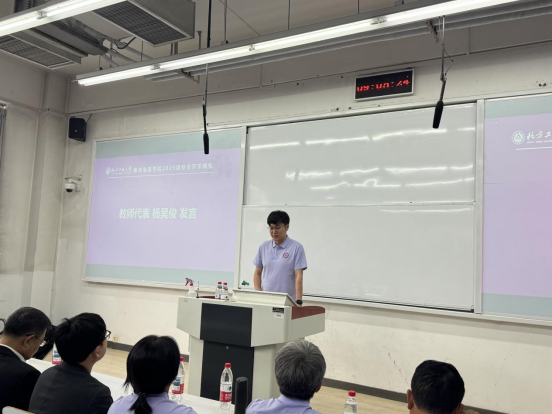 新生班导师杨昊俊老师代表全院教师,带来大学之旅的三把钥匙—— Spirit(工匠精神)、Innovation(创新力)、Collaboration(协同合作),鼓励所有同学努力成长为驱动未来的“芯”一代力量。