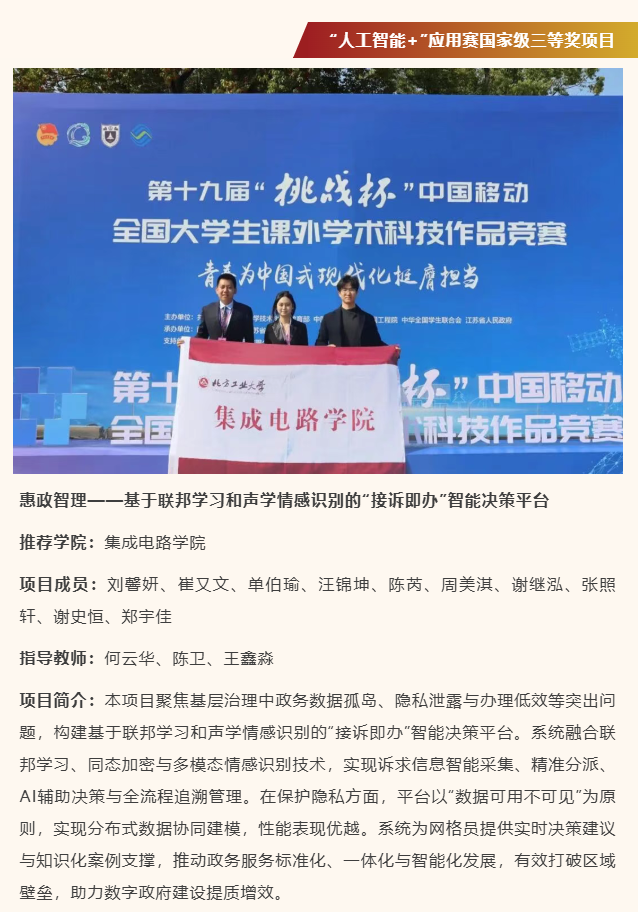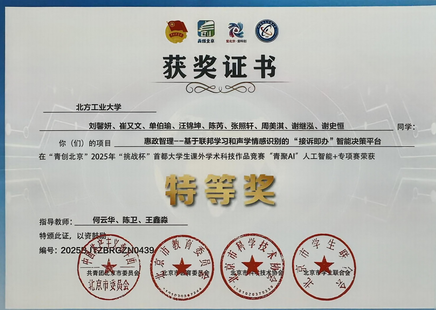 44118太阳成城集团优秀学子获得“青创北京”2025年“挑战杯”首都大学生课外学术科技作品竞赛“青聚AI”人工智能+专项赛,特等奖1项: