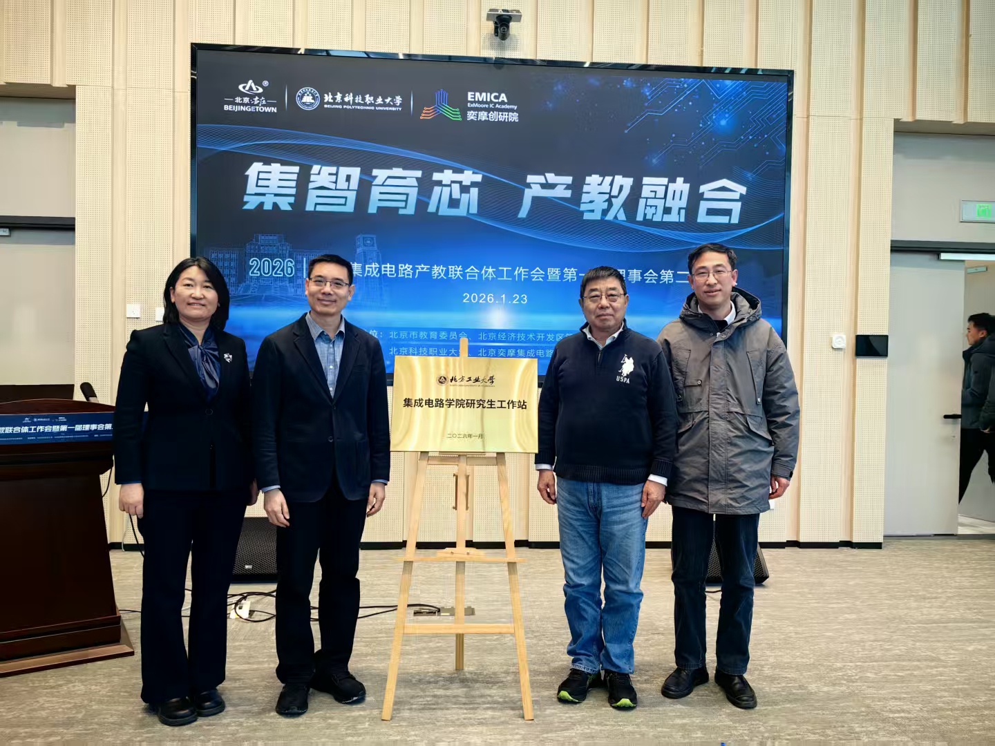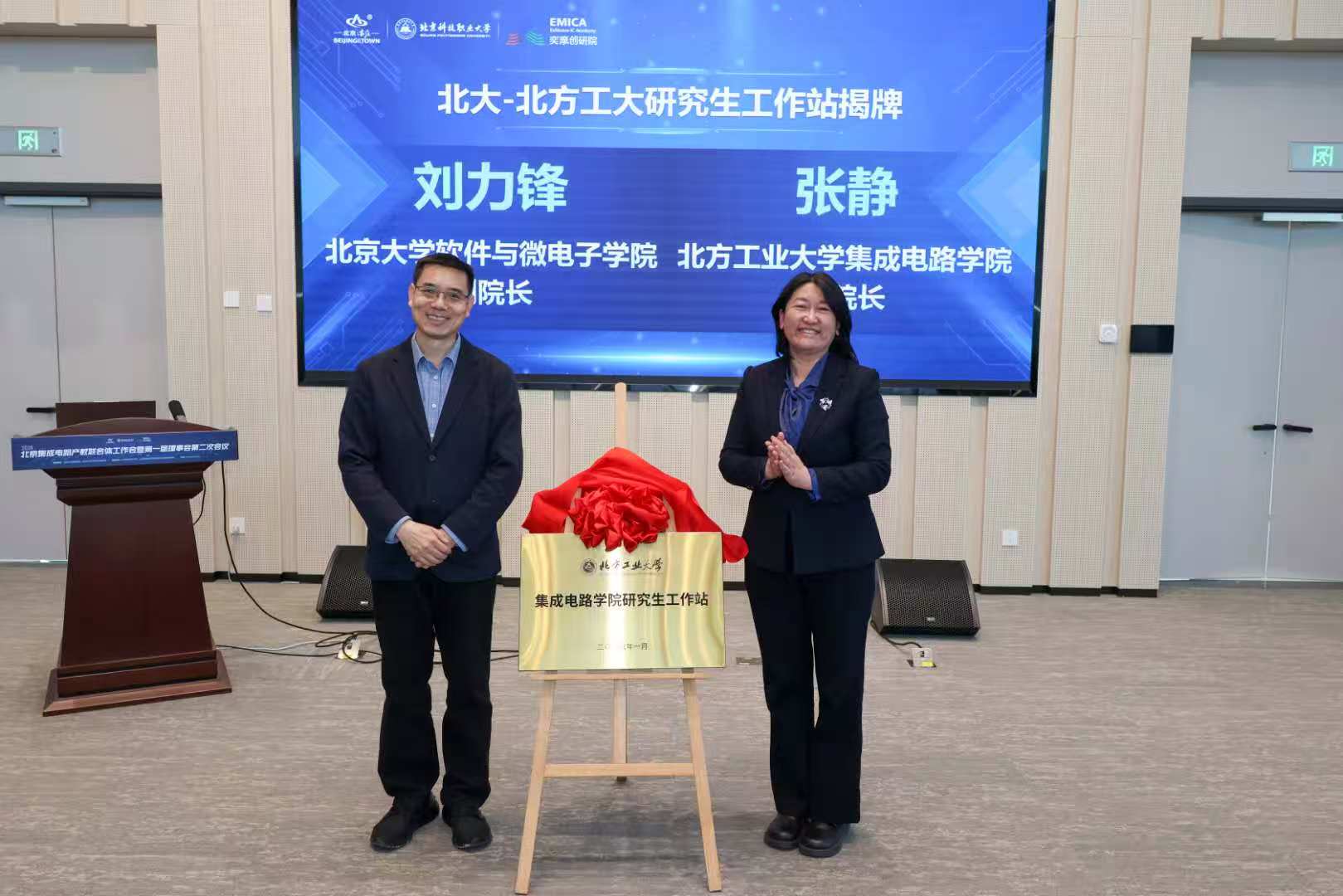 在此次会议上,我校44118太阳成城集团与北京大学44118太阳成城集团以“1+1”共建的形式入驻北京集成电路产教融合基地,并共建研究生工作站。北京大学软件与微电子学院副院长刘力锋和我校44118太阳成城集团副院长张静共同为44118太阳成城产教融合基地和研究生工作站揭牌。学院还与胜科纳米科技(北京)有限公司进行了就业实践实习基地的揭牌仪式。