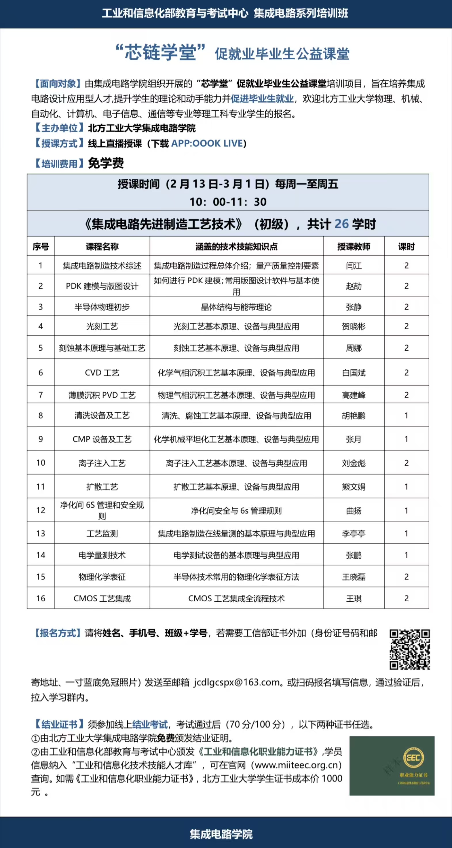 2月13日-3月1日,10:00-11:30《集成电路先进制造工艺技术》(初级);
